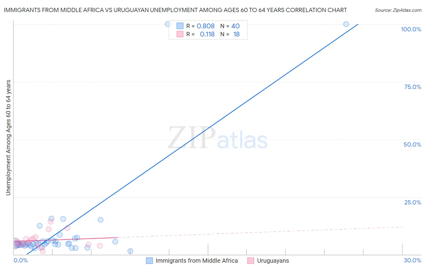 Immigrants from Middle Africa vs Uruguayan Unemployment Among Ages 60 to 64 years Correlation Chart