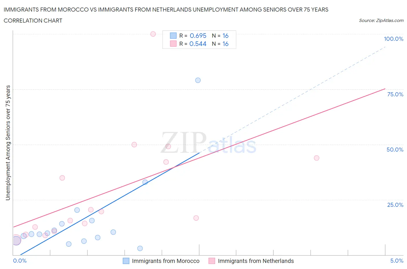 Immigrants from Morocco vs Immigrants from Netherlands Unemployment Among Seniors over 75 years Correlation Chart