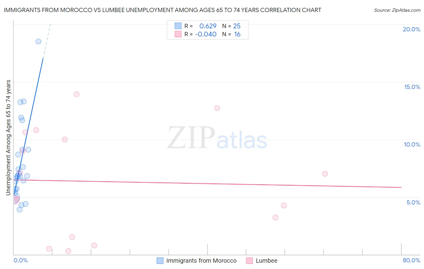 Immigrants from Morocco vs Lumbee Unemployment Among Ages 65 to 74 years Correlation Chart