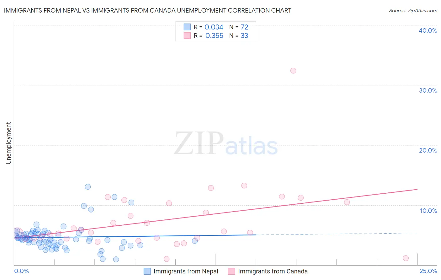 Immigrants from Nepal vs Immigrants from Canada Unemployment Correlation Chart