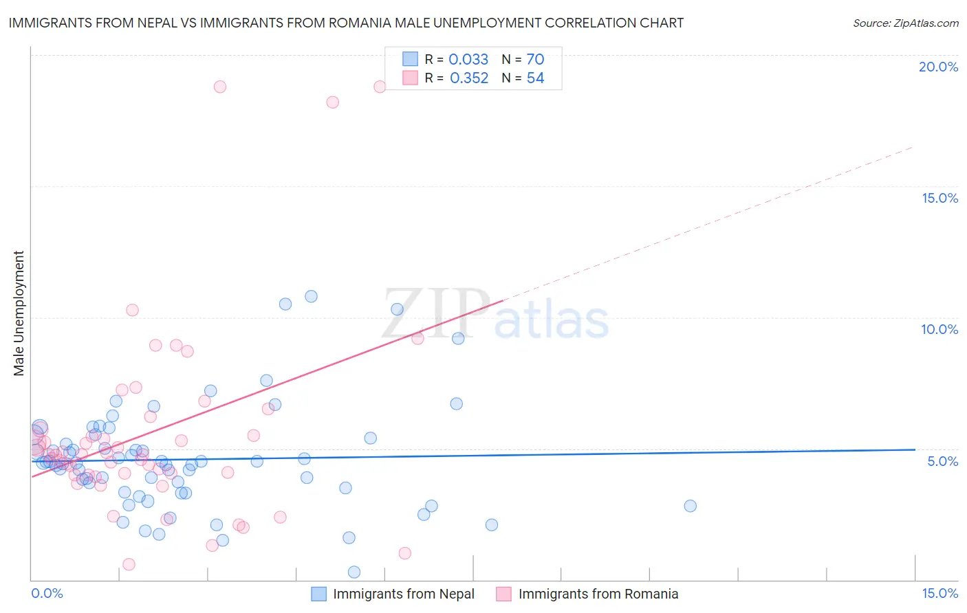 Immigrants from Nepal vs Immigrants from Romania Male Unemployment Correlation Chart