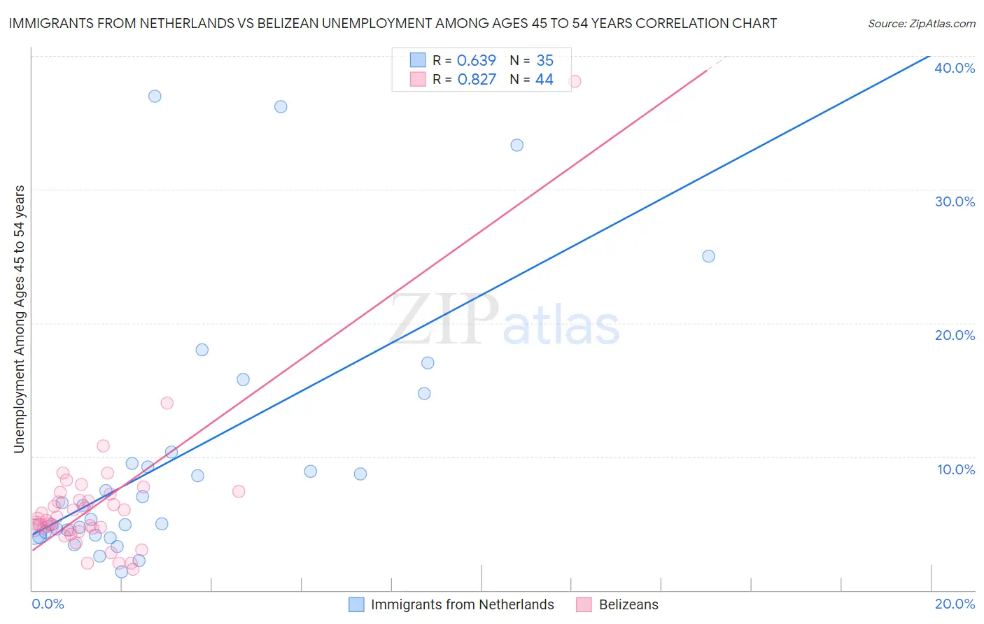 Immigrants from Netherlands vs Belizean Unemployment Among Ages 45 to 54 years Correlation Chart