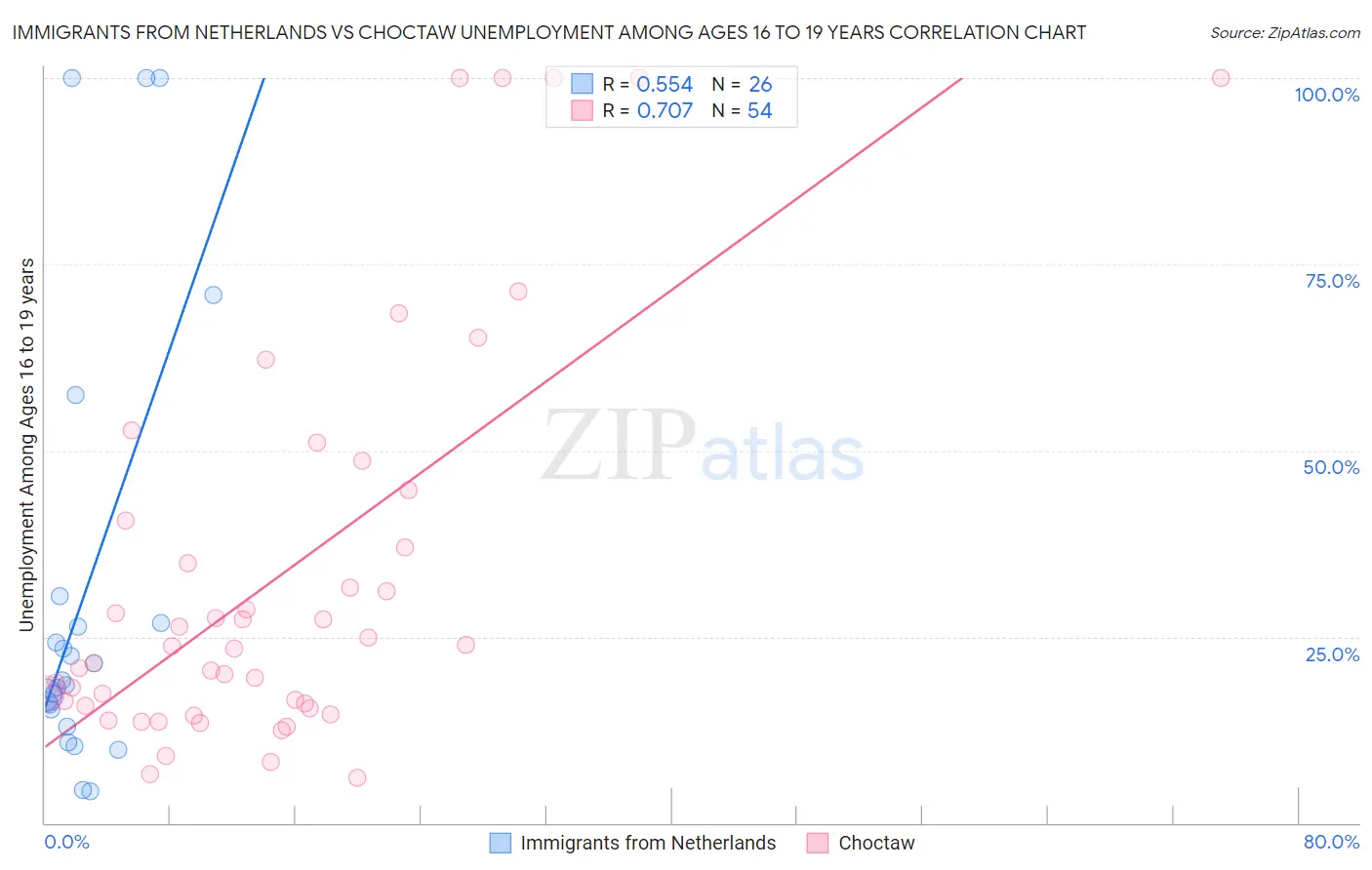 Immigrants from Netherlands vs Choctaw Unemployment Among Ages 16 to 19 years Correlation Chart