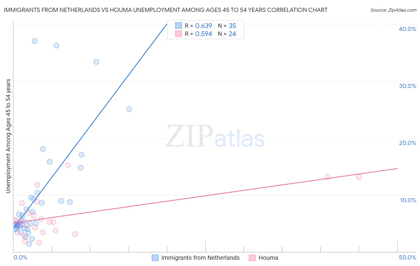 Immigrants from Netherlands vs Houma Unemployment Among Ages 45 to 54 years Correlation Chart