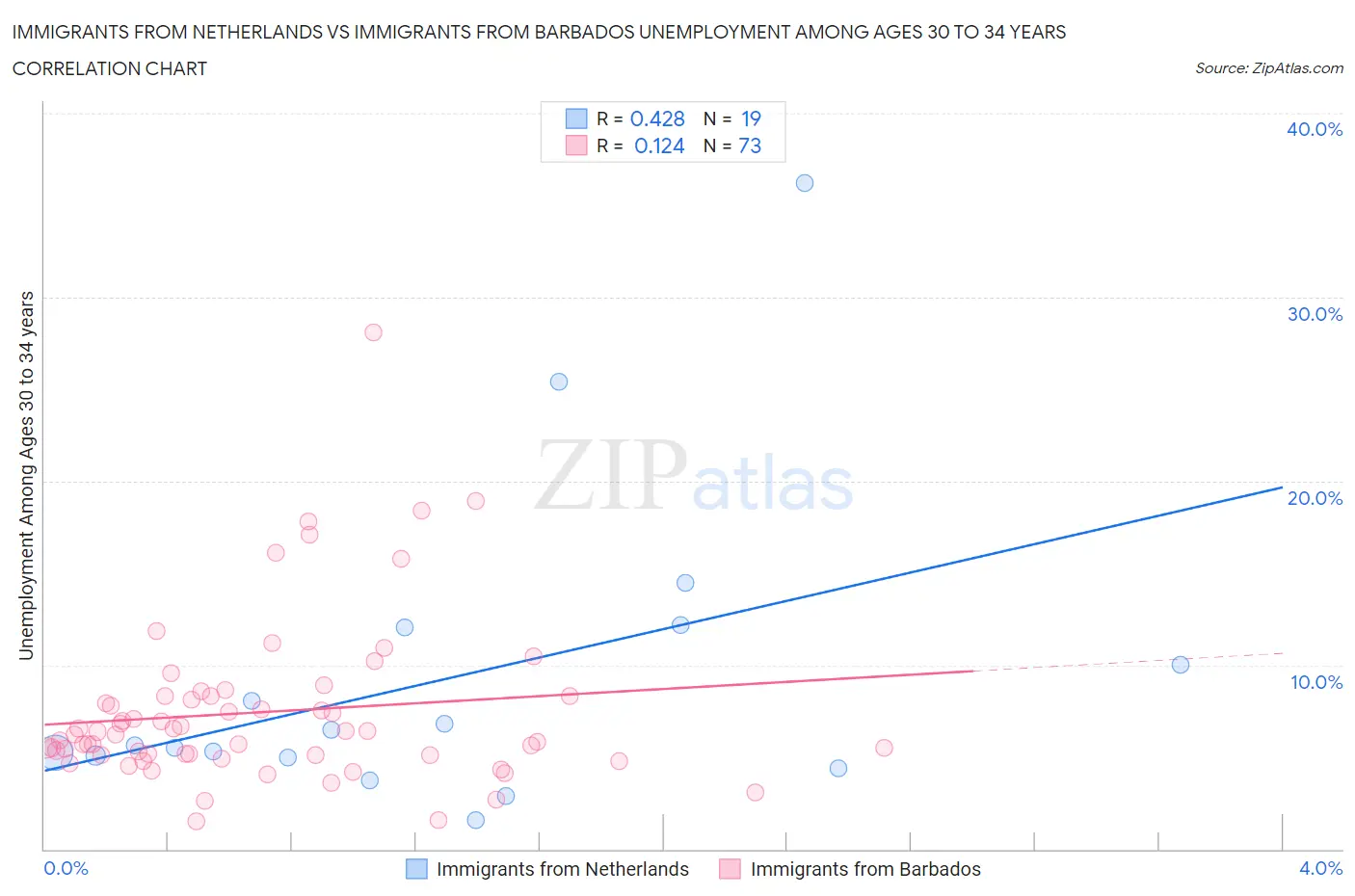 Immigrants from Netherlands vs Immigrants from Barbados Unemployment Among Ages 30 to 34 years Correlation Chart
