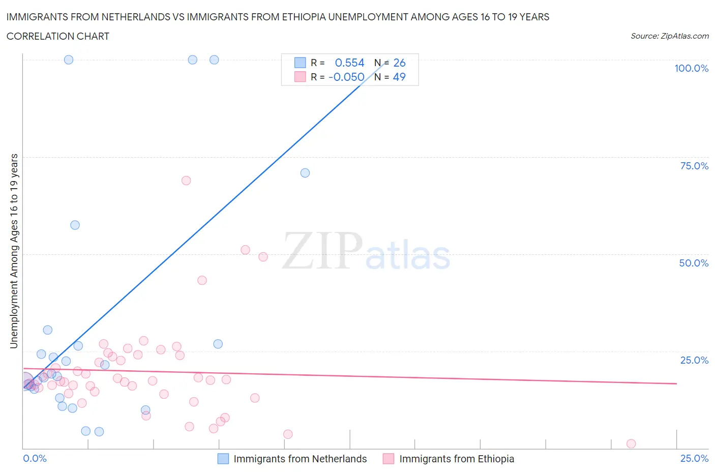 Immigrants from Netherlands vs Immigrants from Ethiopia Unemployment Among Ages 16 to 19 years Correlation Chart