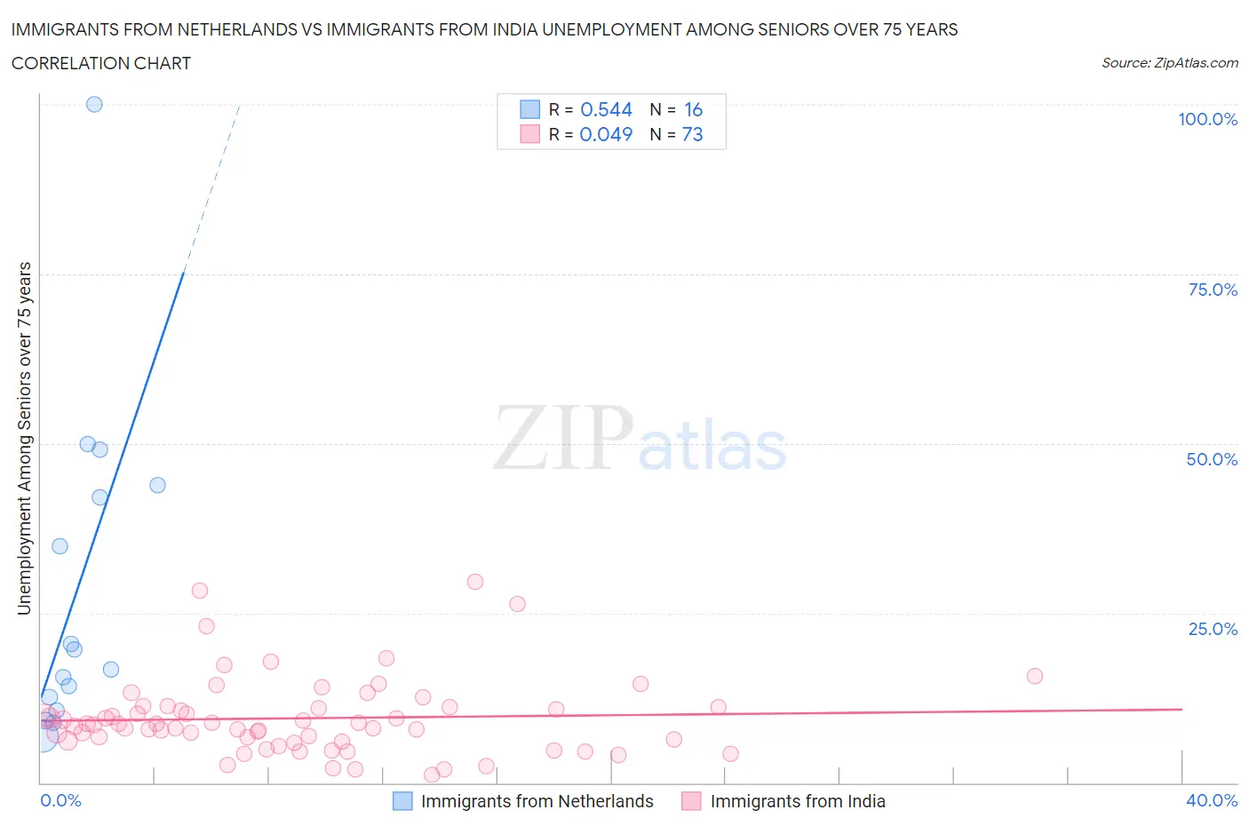 Immigrants from Netherlands vs Immigrants from India Unemployment Among Seniors over 75 years Correlation Chart