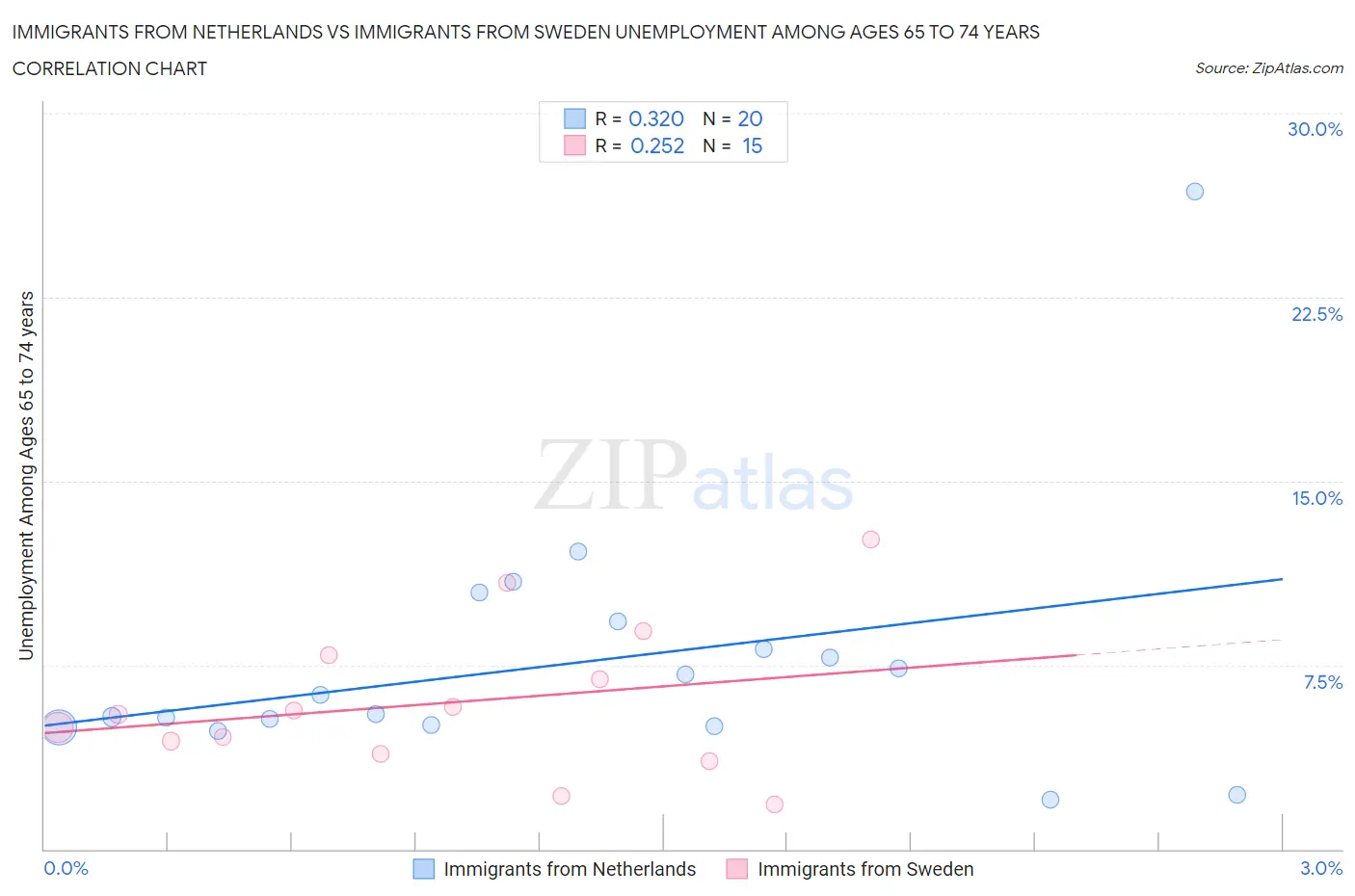 Immigrants from Netherlands vs Immigrants from Sweden Unemployment Among Ages 65 to 74 years