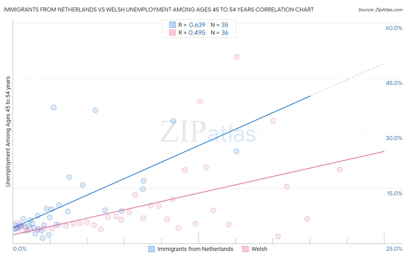 Immigrants from Netherlands vs Welsh Unemployment Among Ages 45 to 54 years Correlation Chart