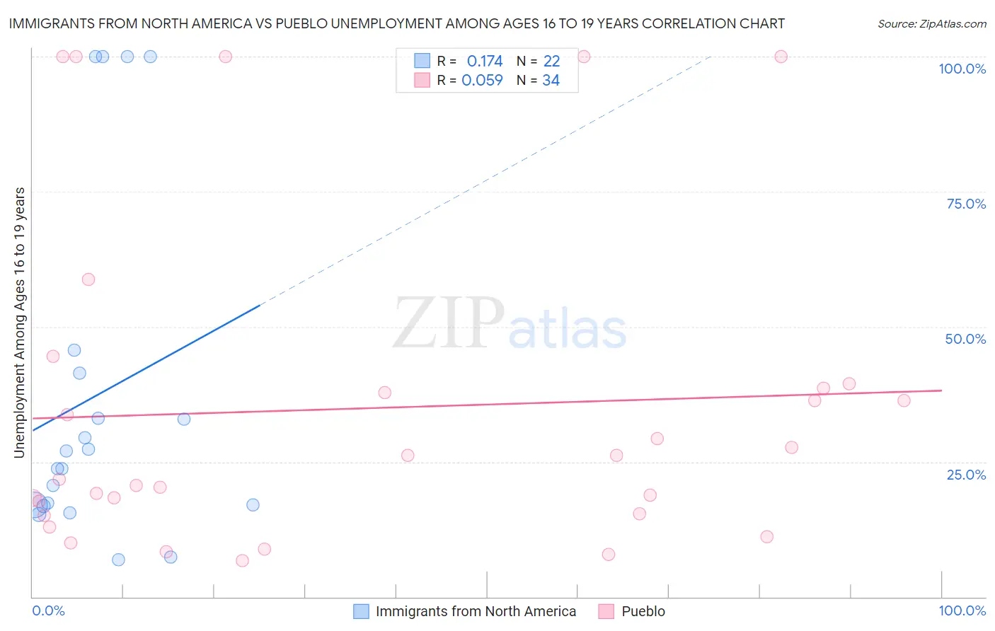 Immigrants from North America vs Pueblo Unemployment Among Ages 16 to 19 years
