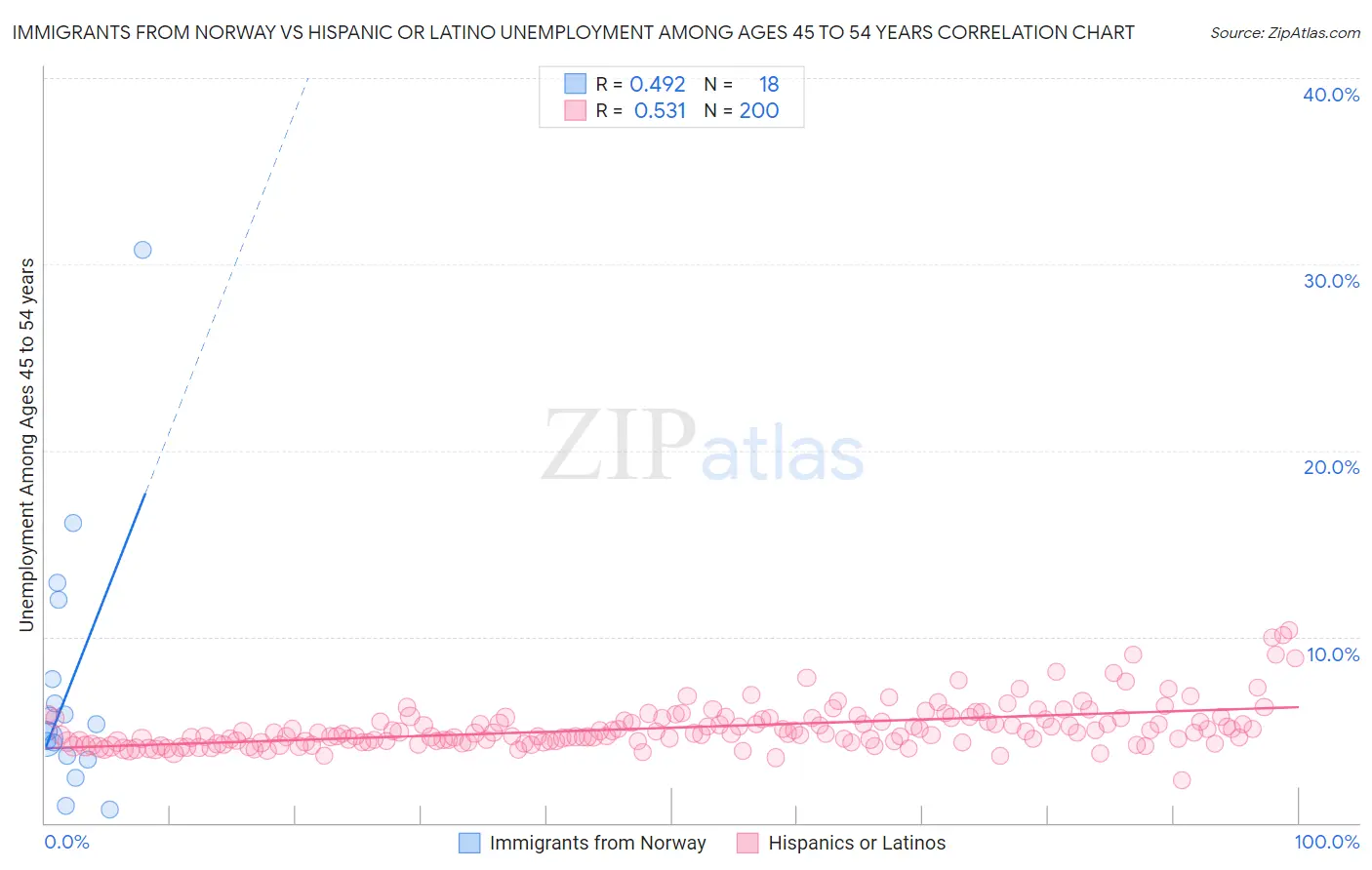 Immigrants from Norway vs Hispanic or Latino Unemployment Among Ages 45 to 54 years Correlation Chart