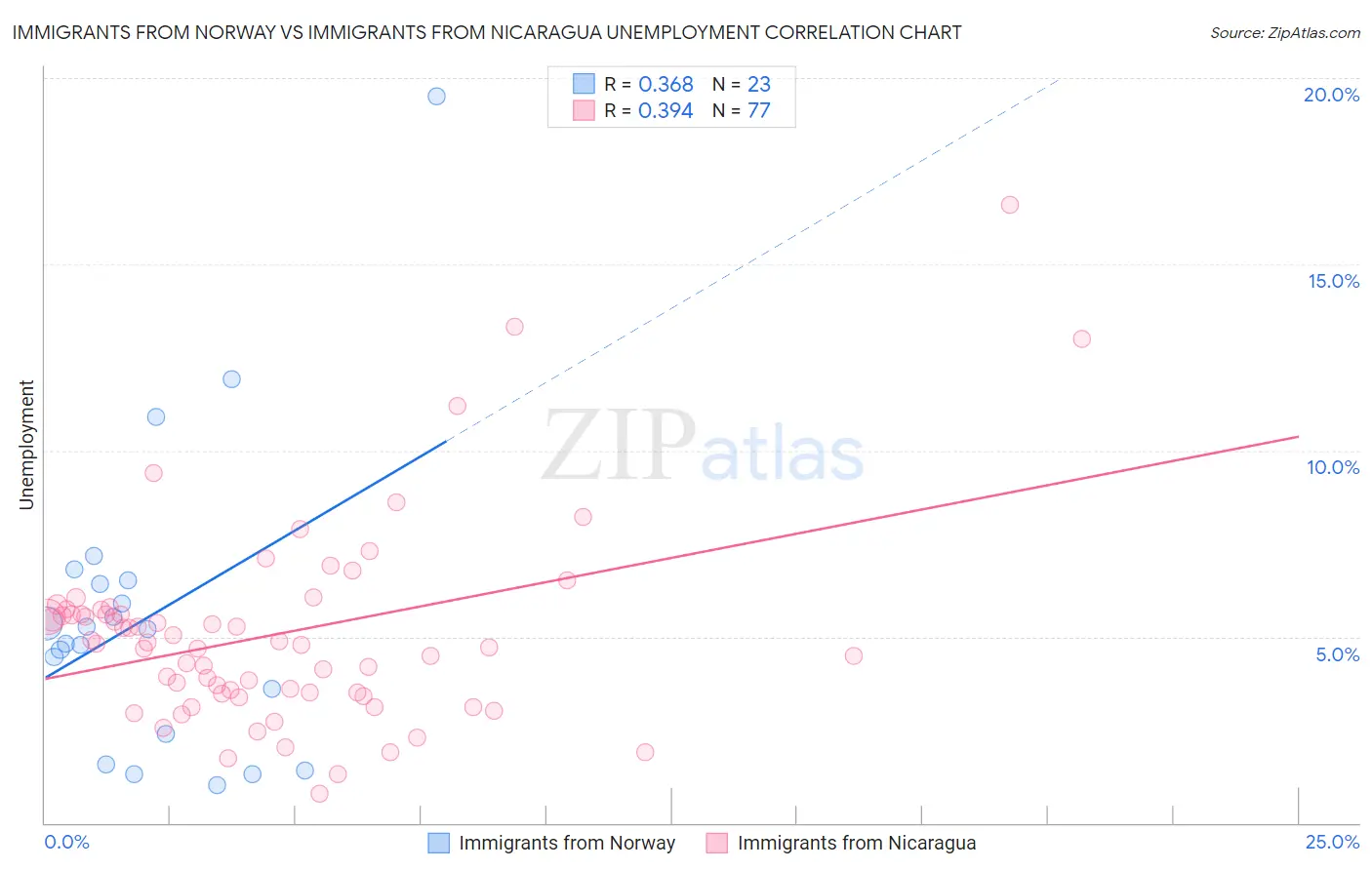 Immigrants from Norway vs Immigrants from Nicaragua Unemployment Correlation Chart