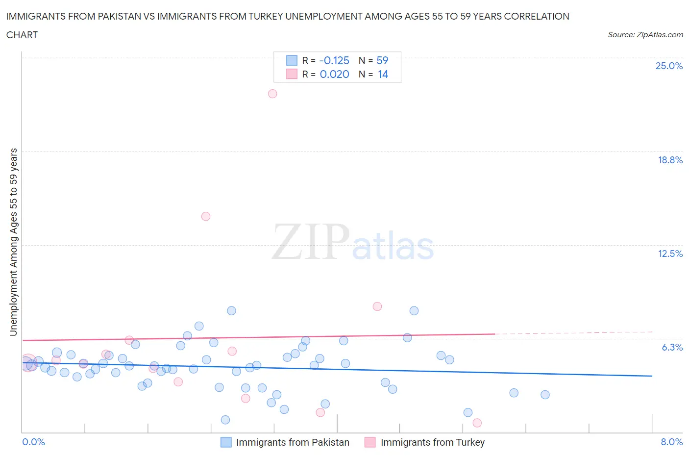 Immigrants from Pakistan vs Immigrants from Turkey Unemployment Among Ages 55 to 59 years Correlation Chart