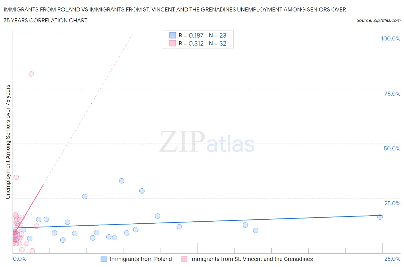 Immigrants from Poland vs Immigrants from St. Vincent and the Grenadines Unemployment Among Seniors over 75 years Correlation Chart