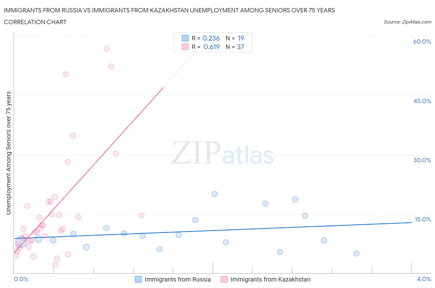 Immigrants from Russia vs Immigrants from Kazakhstan Unemployment Among Seniors over 75 years Correlation Chart