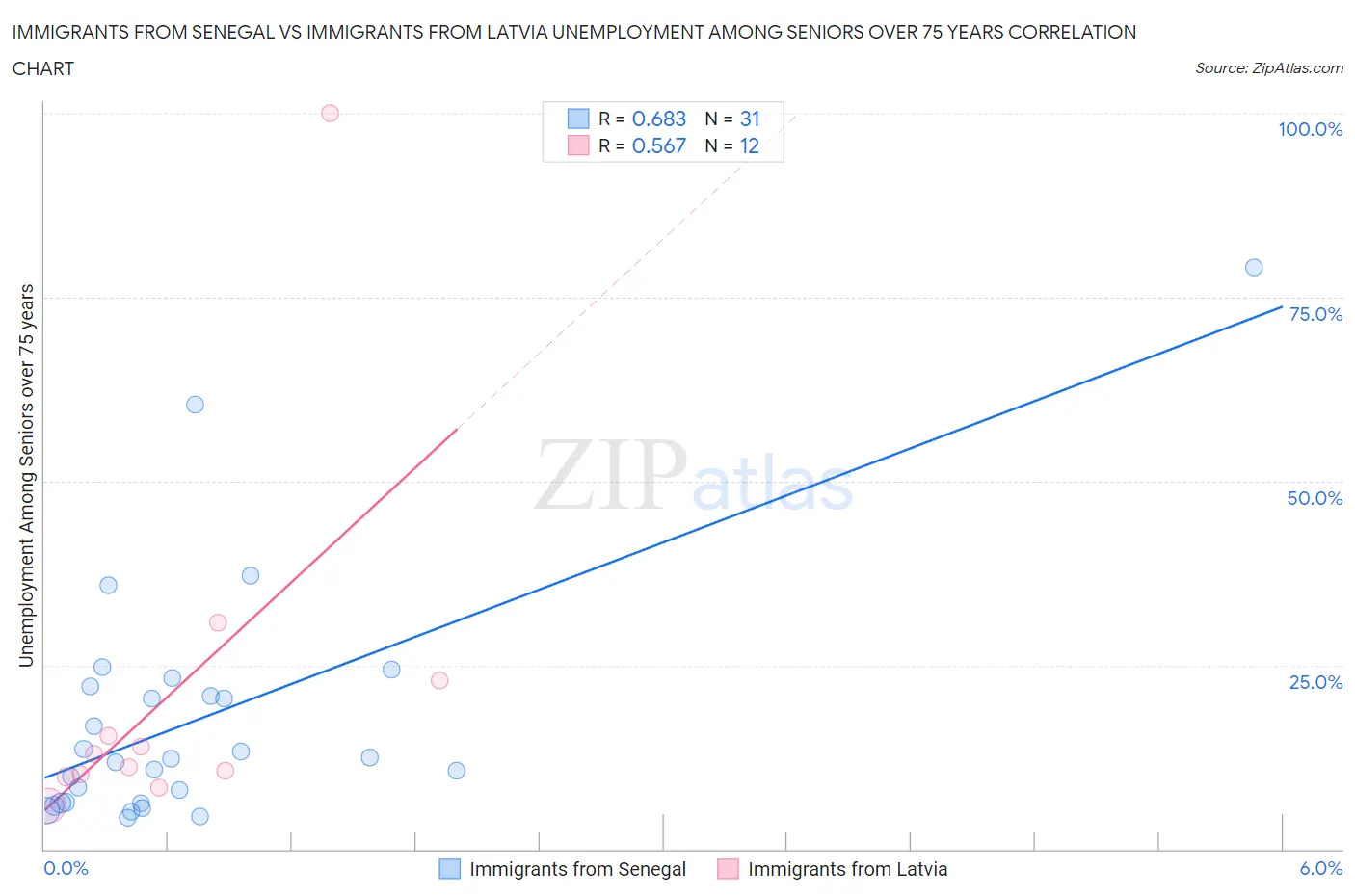 Immigrants from Senegal vs Immigrants from Latvia Unemployment Among Seniors over 75 years Correlation Chart