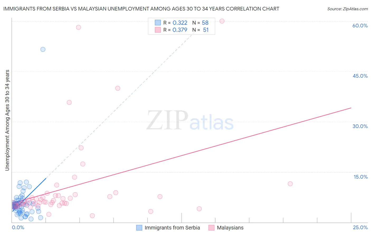 Immigrants from Serbia vs Malaysian Unemployment Among Ages 30 to 34 years Correlation Chart