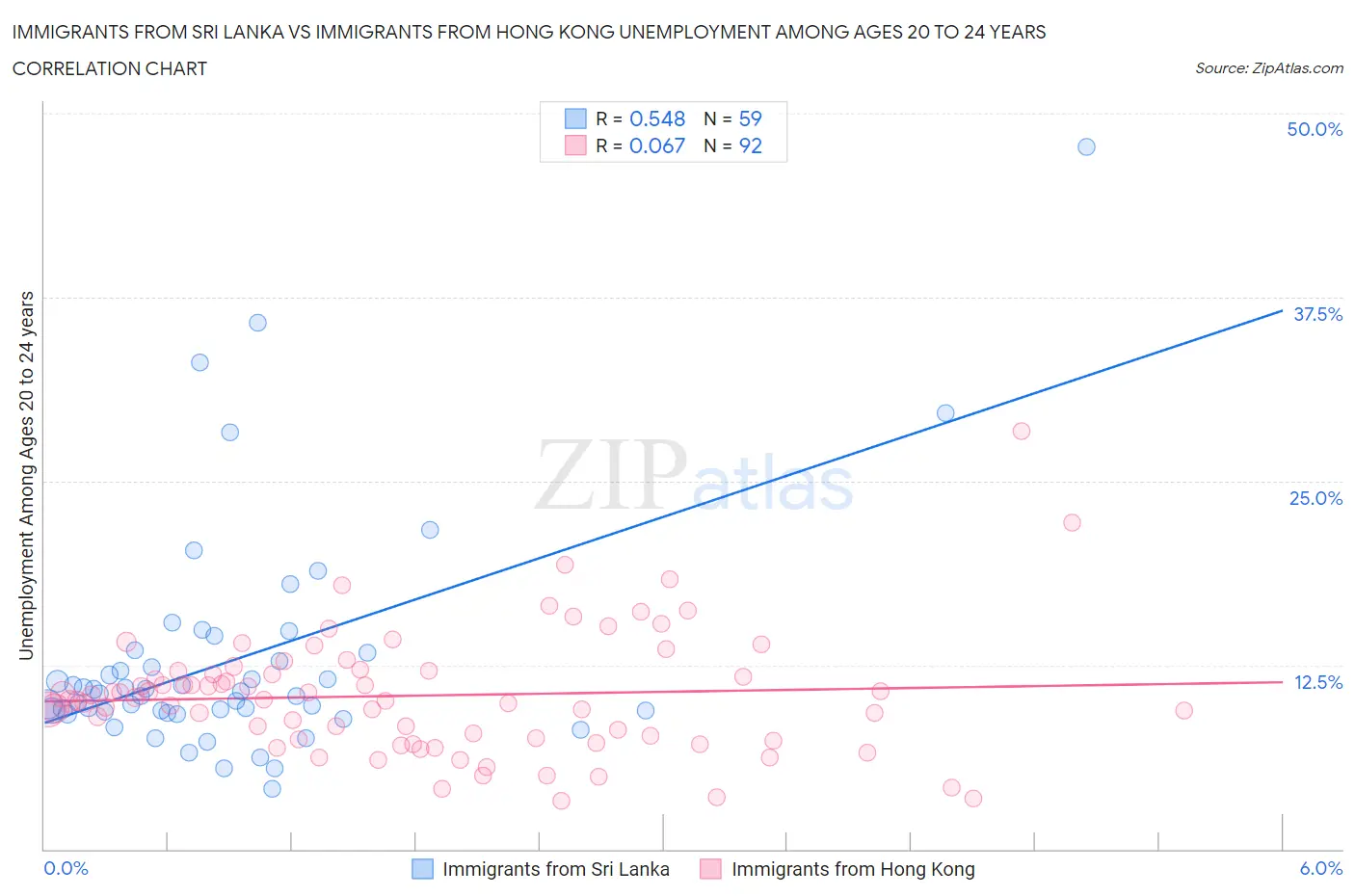 Immigrants from Sri Lanka vs Immigrants from Hong Kong Unemployment Among Ages 20 to 24 years Correlation Chart