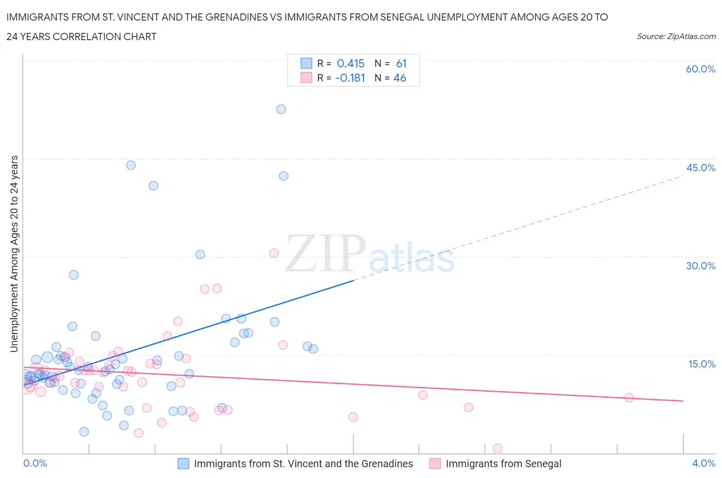 Immigrants from St. Vincent and the Grenadines vs Immigrants from Senegal Unemployment Among Ages 20 to 24 years Correlation Chart