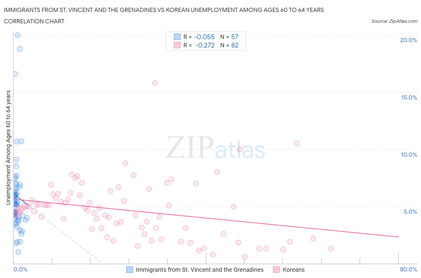 Immigrants from St. Vincent and the Grenadines vs Korean Unemployment Among Ages 60 to 64 years Correlation Chart