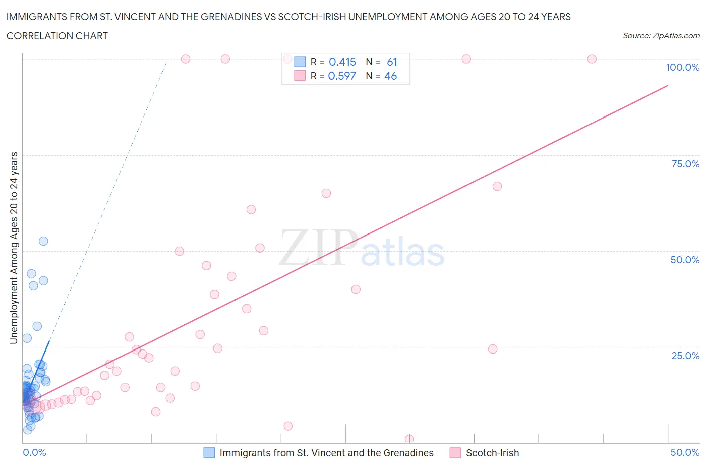 Immigrants from St. Vincent and the Grenadines vs Scotch-Irish Unemployment Among Ages 20 to 24 years Correlation Chart