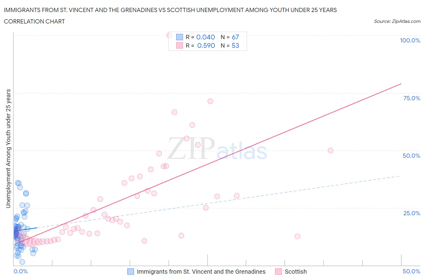 Immigrants from St. Vincent and the Grenadines vs Scottish Unemployment Among Youth under 25 years Correlation Chart