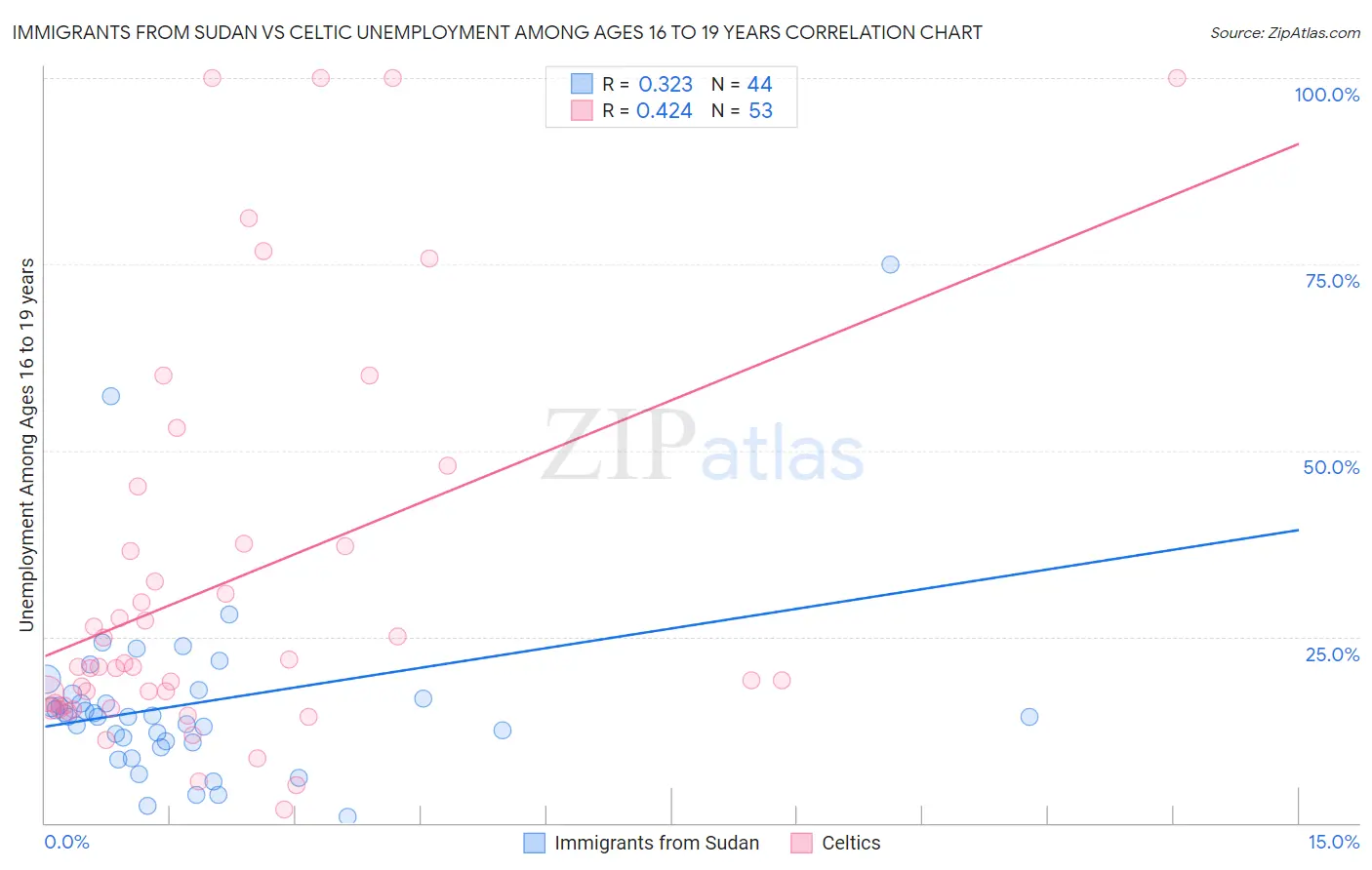 Immigrants from Sudan vs Celtic Unemployment Among Ages 16 to 19 years Correlation Chart