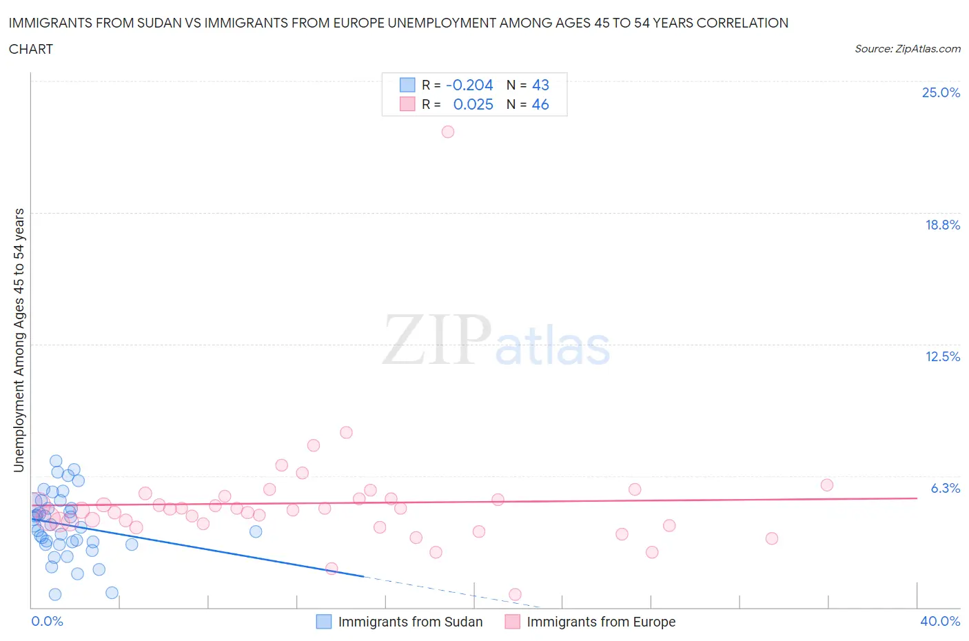 Immigrants from Sudan vs Immigrants from Europe Unemployment Among Ages 45 to 54 years Correlation Chart