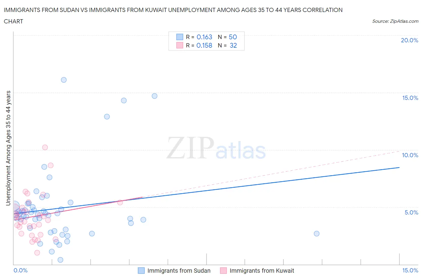 Immigrants from Sudan vs Immigrants from Kuwait Unemployment Among Ages 35 to 44 years Correlation Chart
