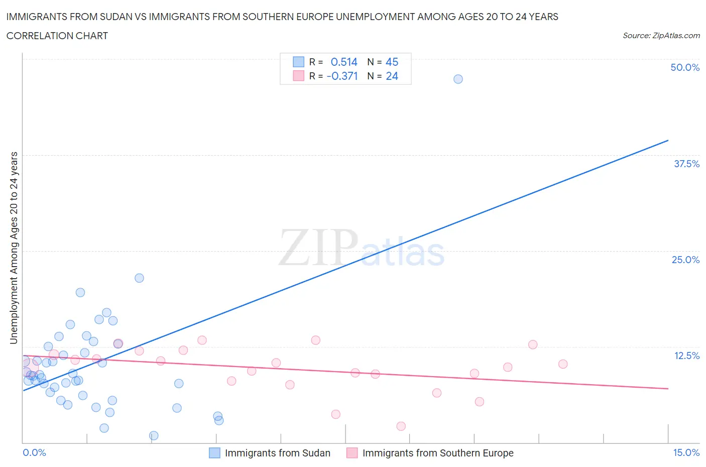 Immigrants from Sudan vs Immigrants from Southern Europe Unemployment Among Ages 20 to 24 years Correlation Chart