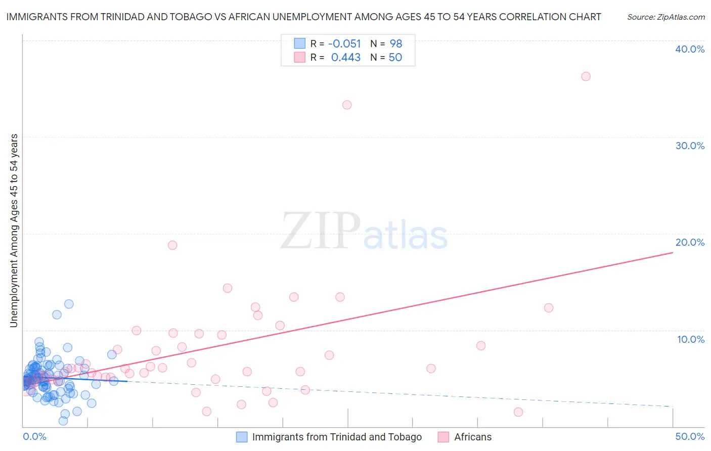 Immigrants from Trinidad and Tobago vs African Unemployment Among Ages 45 to 54 years Correlation Chart