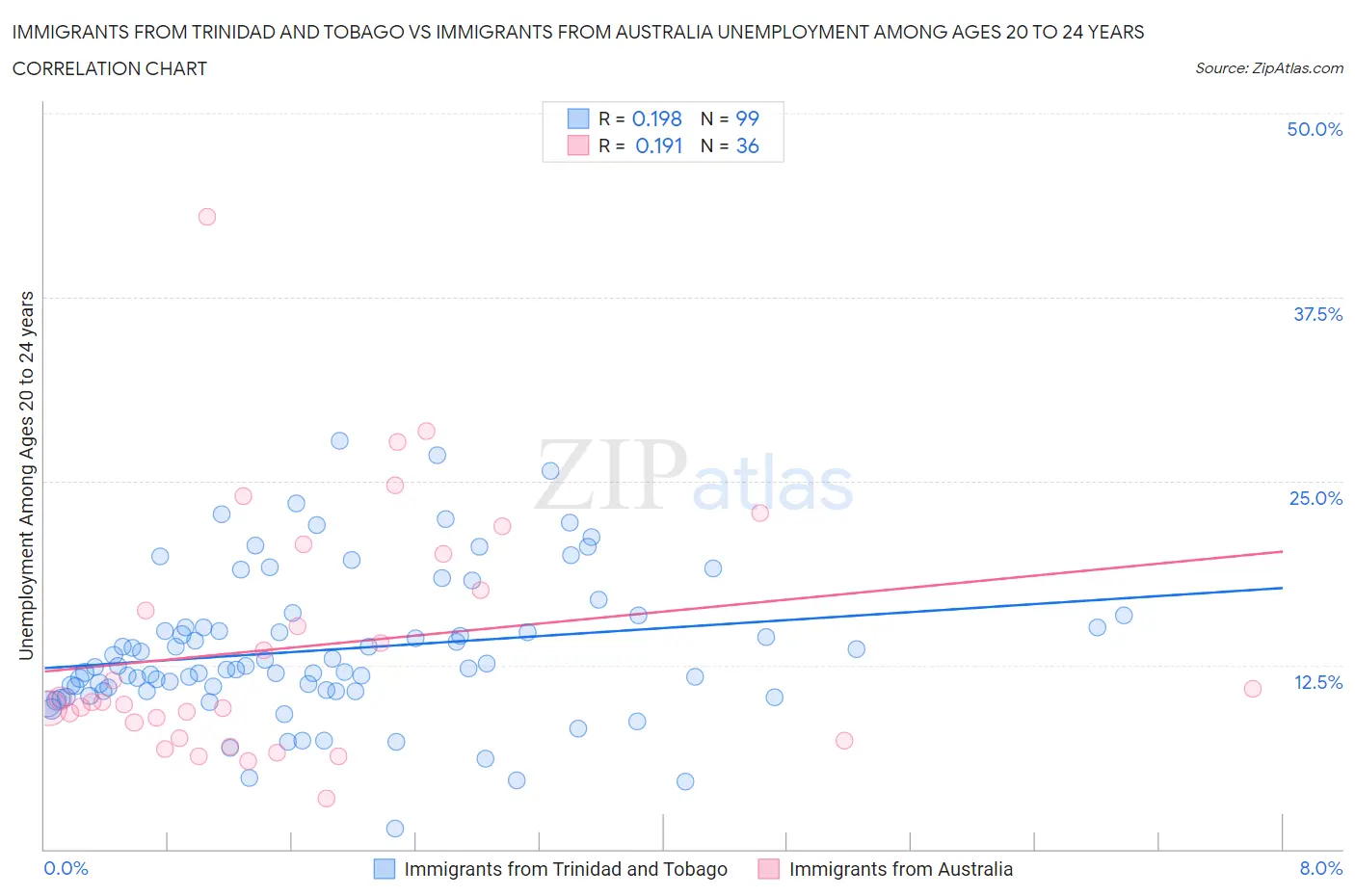 Immigrants from Trinidad and Tobago vs Immigrants from Australia Unemployment Among Ages 20 to 24 years Correlation Chart