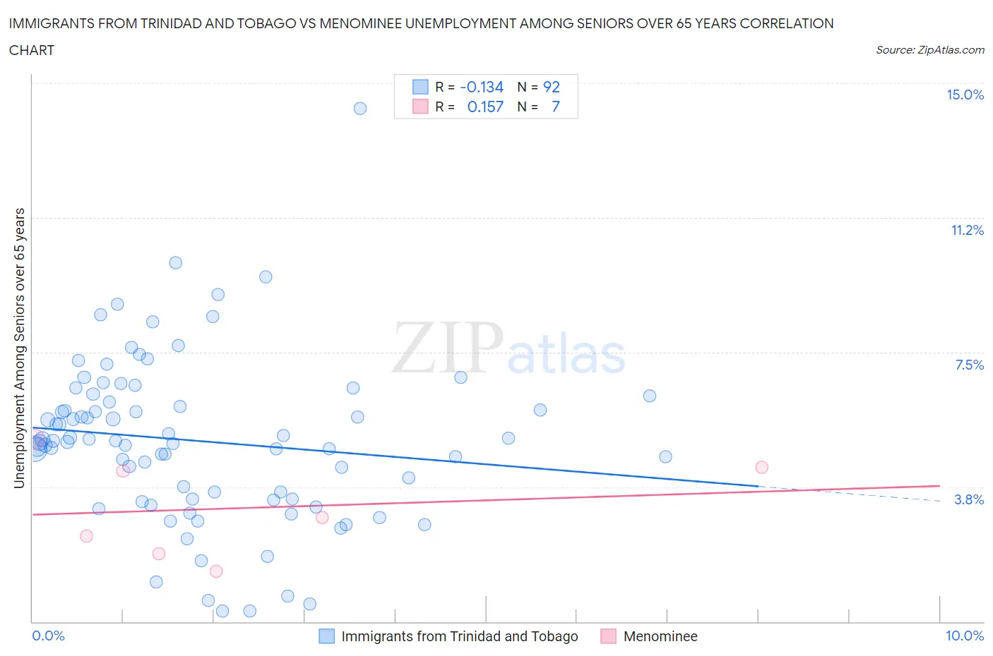 Immigrants from Trinidad and Tobago vs Menominee Unemployment Among Seniors over 65 years Correlation Chart