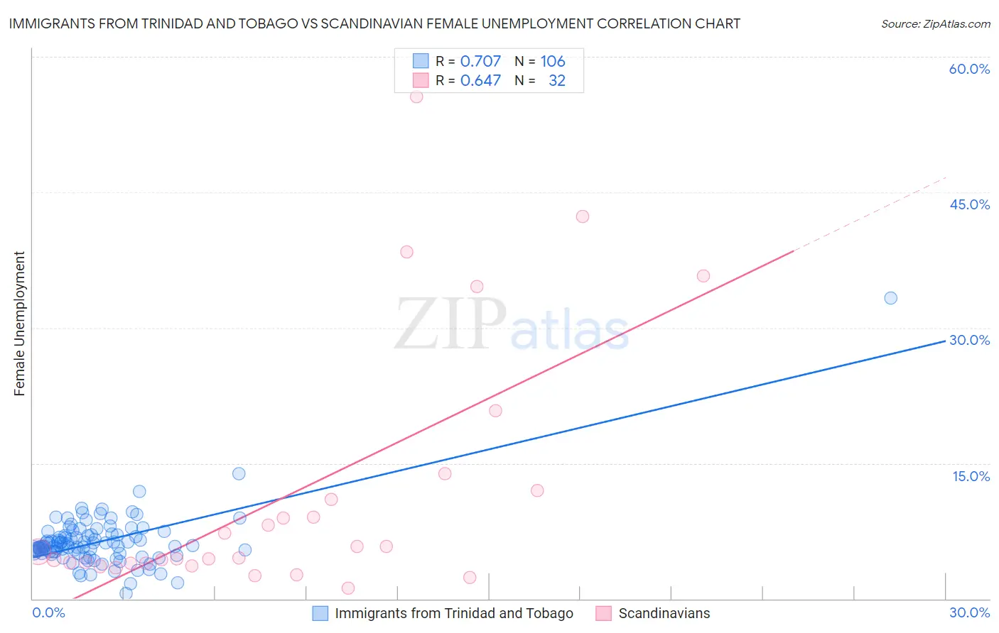 Immigrants from Trinidad and Tobago vs Scandinavian Female Unemployment Correlation Chart
