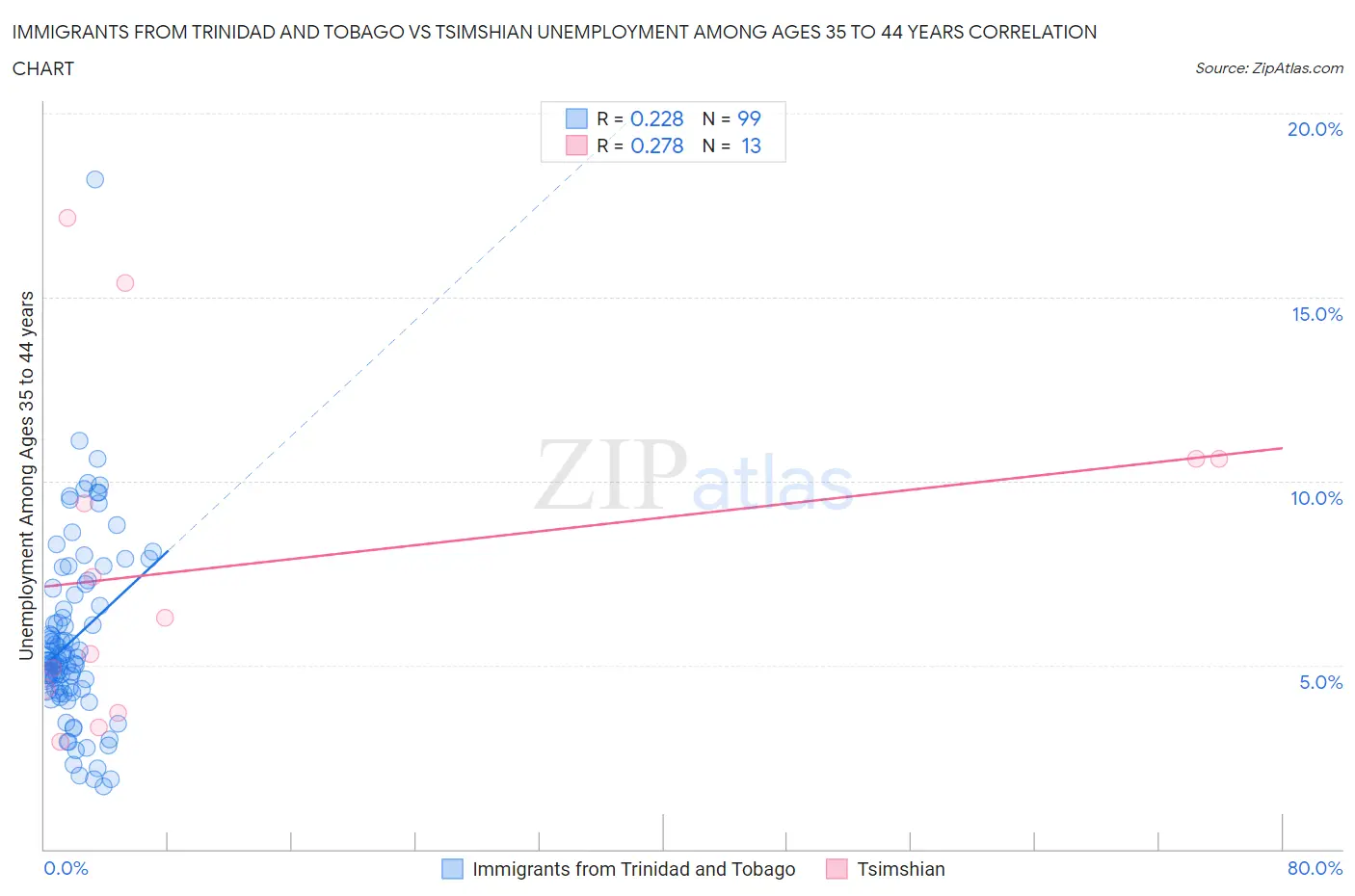 Immigrants from Trinidad and Tobago vs Tsimshian Unemployment Among Ages 35 to 44 years Correlation Chart