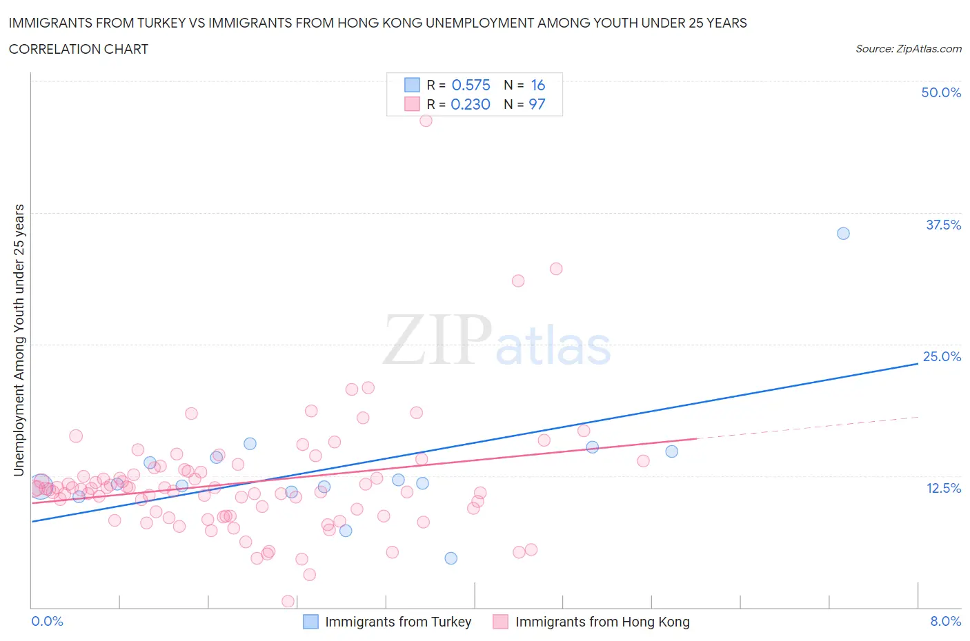 Immigrants from Turkey vs Immigrants from Hong Kong Unemployment Among Youth under 25 years Correlation Chart