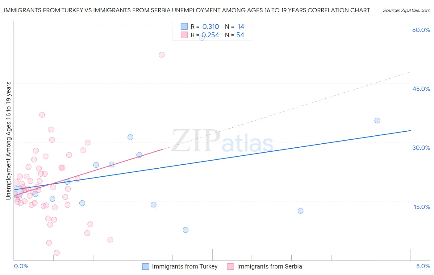 The statistical analysis conducted on geographies consisting of 215,488,732 people shows a mild positive correlation between the proportion of Immigrants from Turkey and unemployment rate among population between the ages 16 and 19 in the United States with a correlation coefficient (R) of 0.310 and weighted average of 17.6%. Similarly, the statistical analysis conducted on geographies consisting of 128,663,488 people shows a weak positive correlation between the proportion of Immigrants from Serbia and unemployment rate among population between the ages 16 and 19 in the United States with a correlation coefficient (R) of 0.254 and weighted average of 18.1%, a difference of 2.6%.