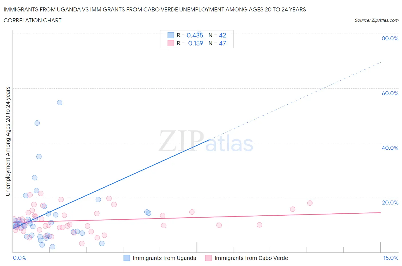 Immigrants from Uganda vs Immigrants from Cabo Verde Unemployment Among Ages 20 to 24 years Correlation Chart