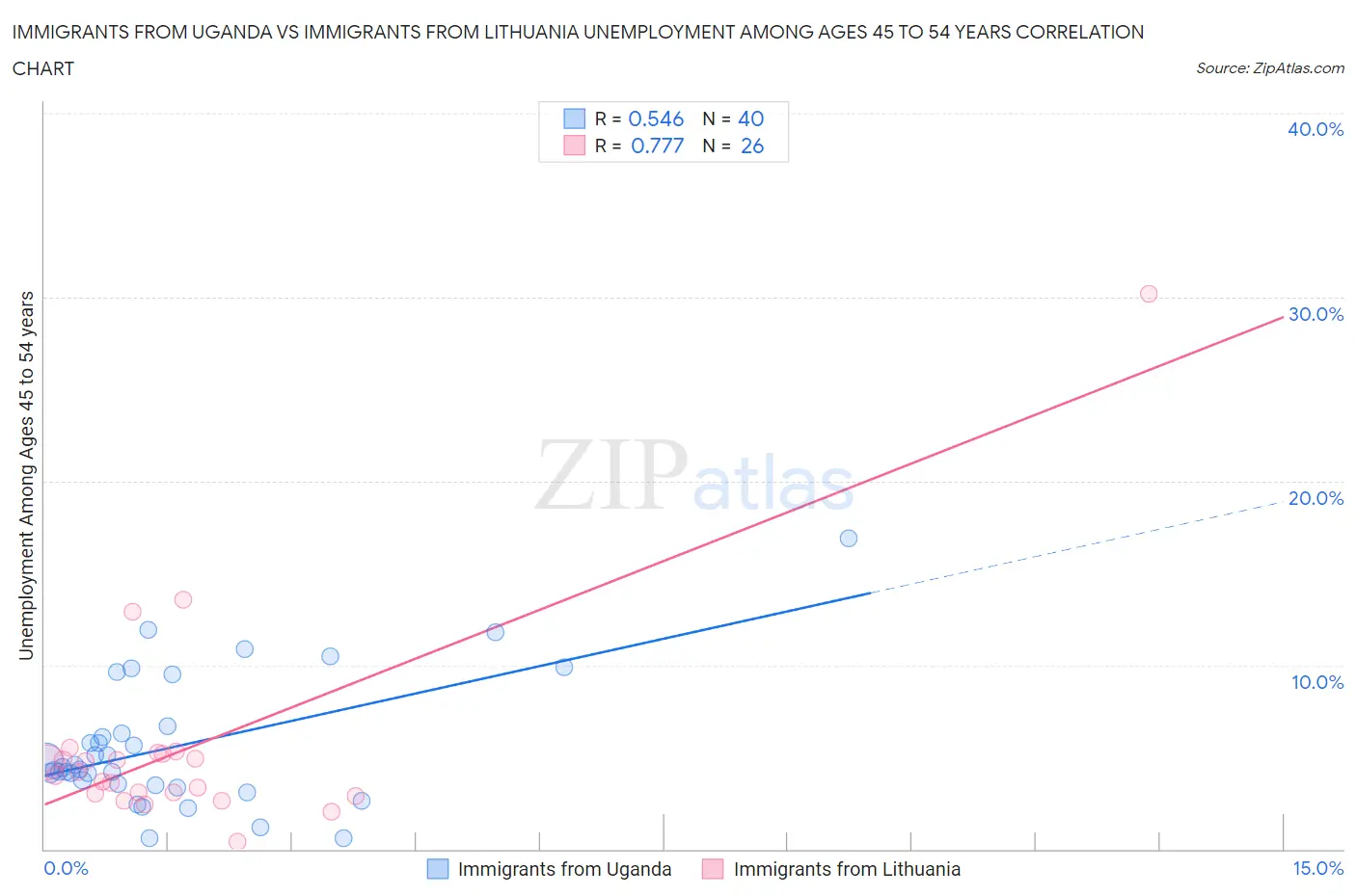 Immigrants from Uganda vs Immigrants from Lithuania Unemployment Among Ages 45 to 54 years Correlation Chart