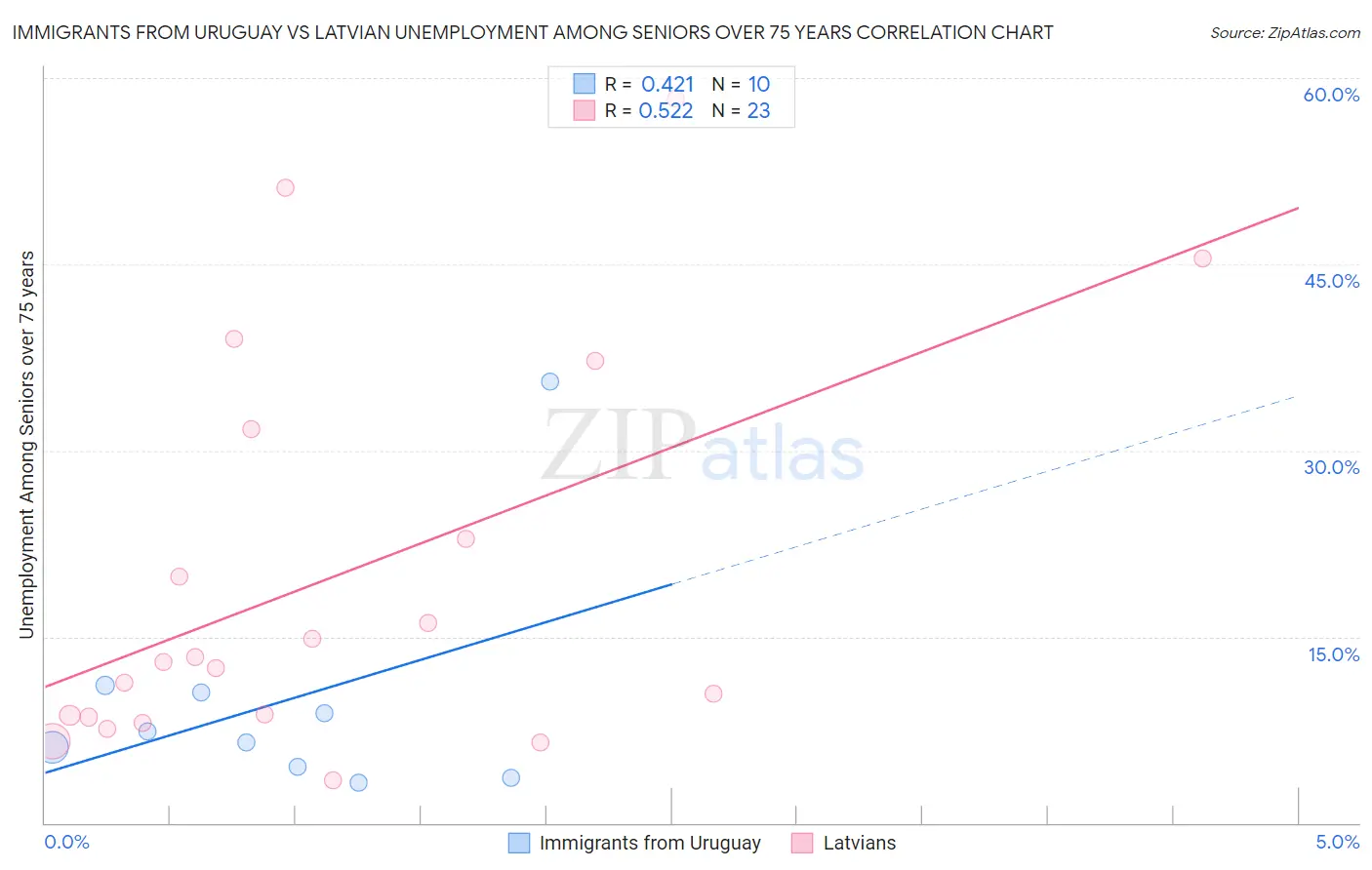 Immigrants from Uruguay vs Latvian Unemployment Among Seniors over 75 years Correlation Chart