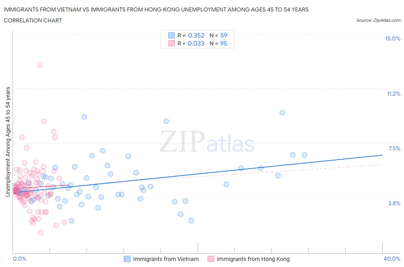 Immigrants from Vietnam vs Immigrants from Hong Kong Unemployment Among Ages 45 to 54 years Correlation Chart