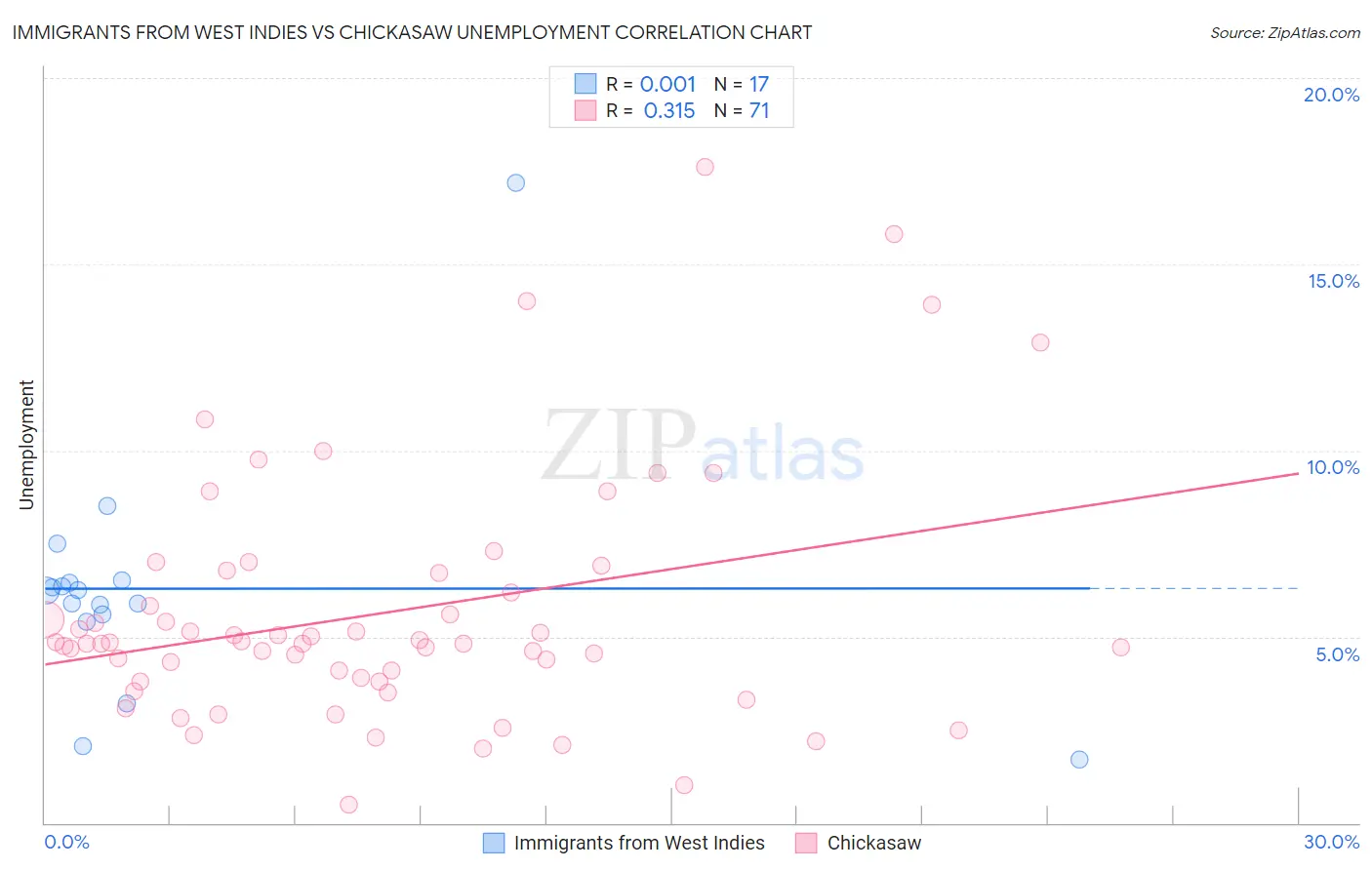 Immigrants from West Indies vs Chickasaw Unemployment Correlation Chart