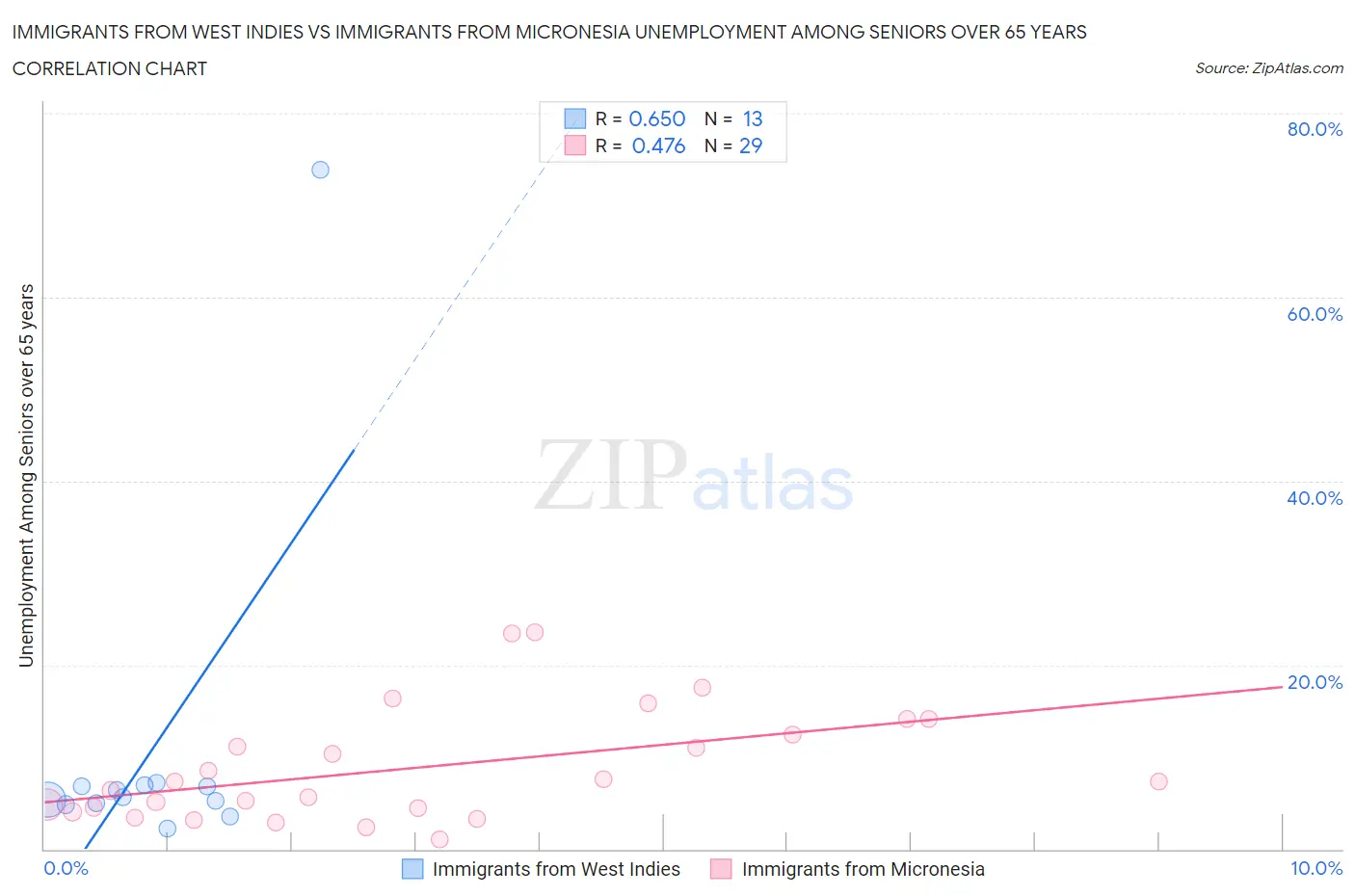Immigrants from West Indies vs Immigrants from Micronesia Unemployment Among Seniors over 65 years Correlation Chart