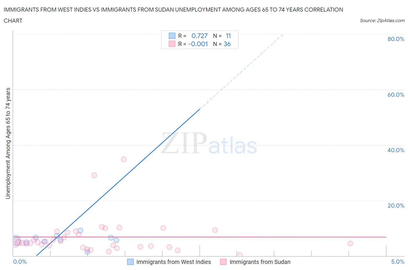 Immigrants from West Indies vs Immigrants from Sudan Unemployment Among Ages 65 to 74 years Correlation Chart
