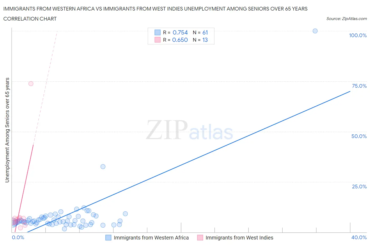 Immigrants from Western Africa vs Immigrants from West Indies Unemployment Among Seniors over 65 years Correlation Chart
