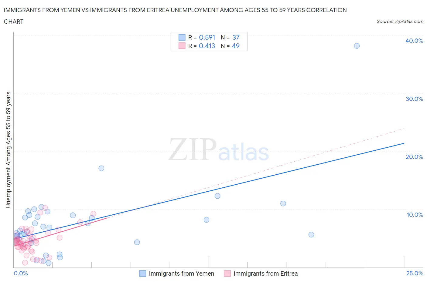Immigrants from Yemen vs Immigrants from Eritrea Unemployment Among Ages 55 to 59 years Correlation Chart
