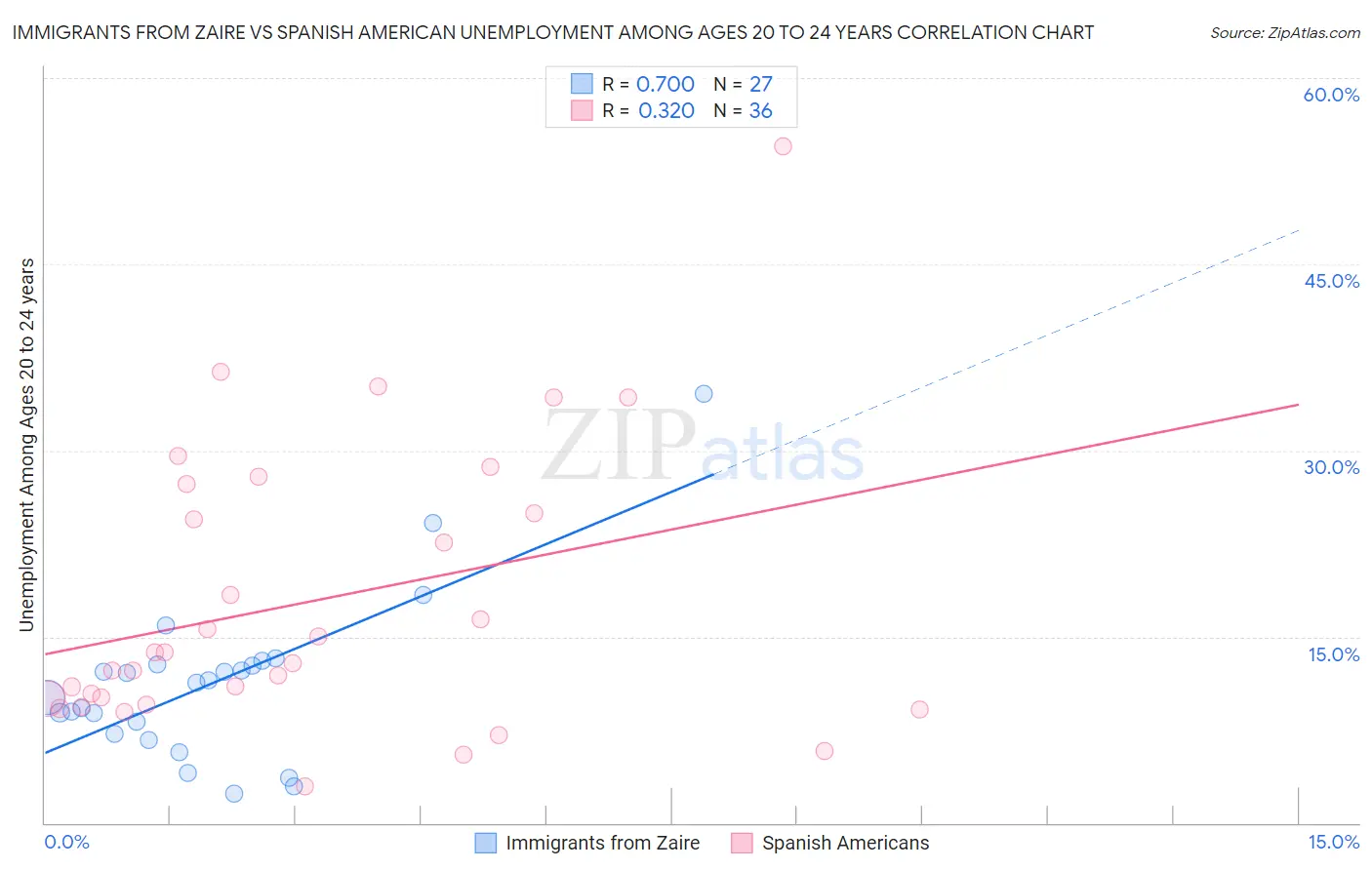 Immigrants from Zaire vs Spanish American Unemployment Among Ages 20 to 24 years Correlation Chart