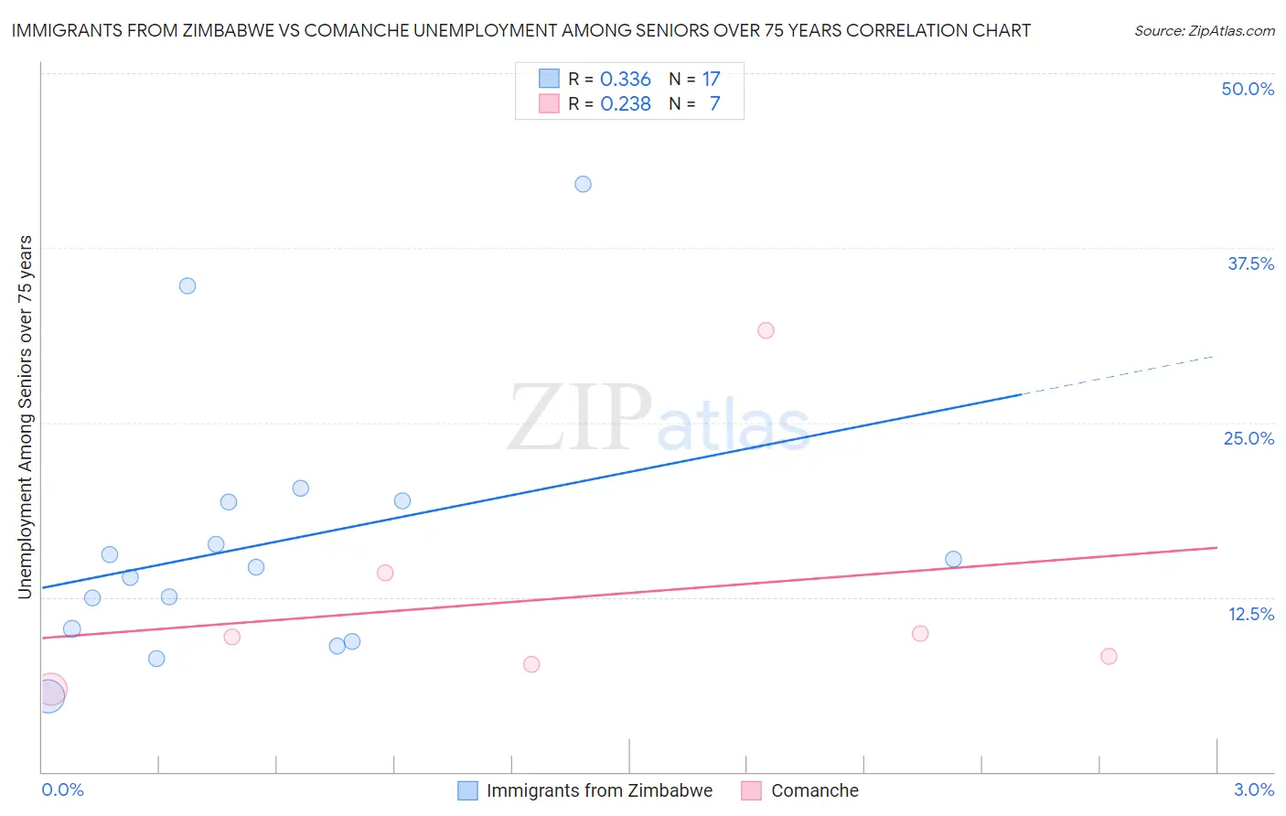 Immigrants from Zimbabwe vs Comanche Unemployment Among Seniors over 75 years Correlation Chart