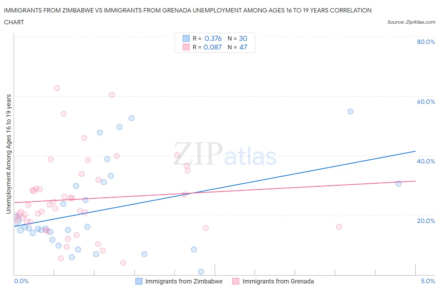 Immigrants from Zimbabwe vs Immigrants from Grenada Unemployment Among Ages 16 to 19 years Correlation Chart
