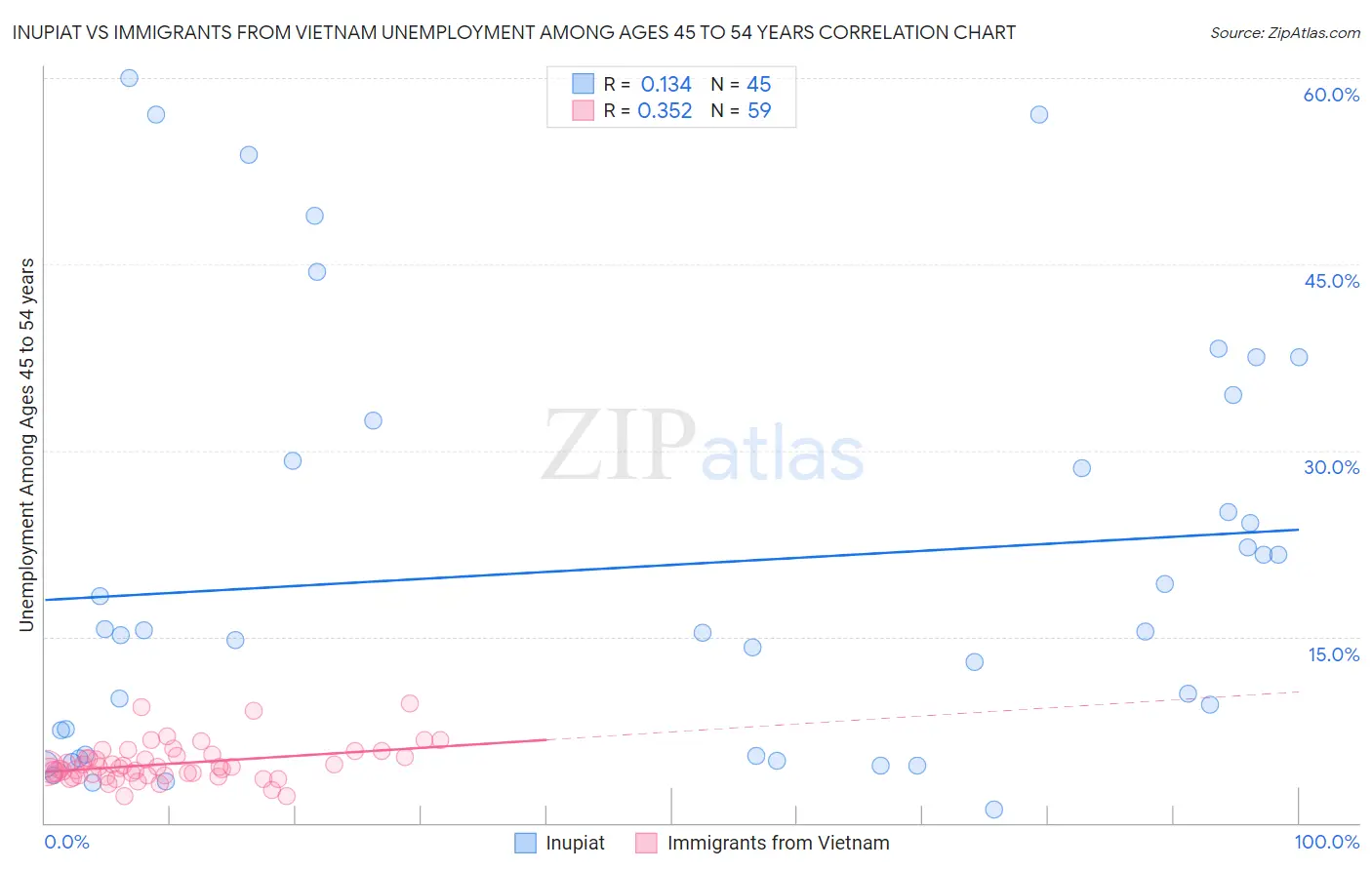 Inupiat vs Immigrants from Vietnam Unemployment Among Ages 45 to 54 years Correlation Chart